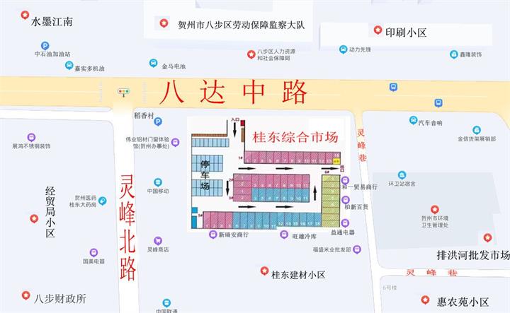 地址位于賀州市八達中路32號,地理位置優(yōu)越,在靈峰北路與八達中路交界處,屬賀州市城區(qū)雜貨批發(fā)商圈核心,一墻之隔有三大電信運營商,人流密集、交通便利。