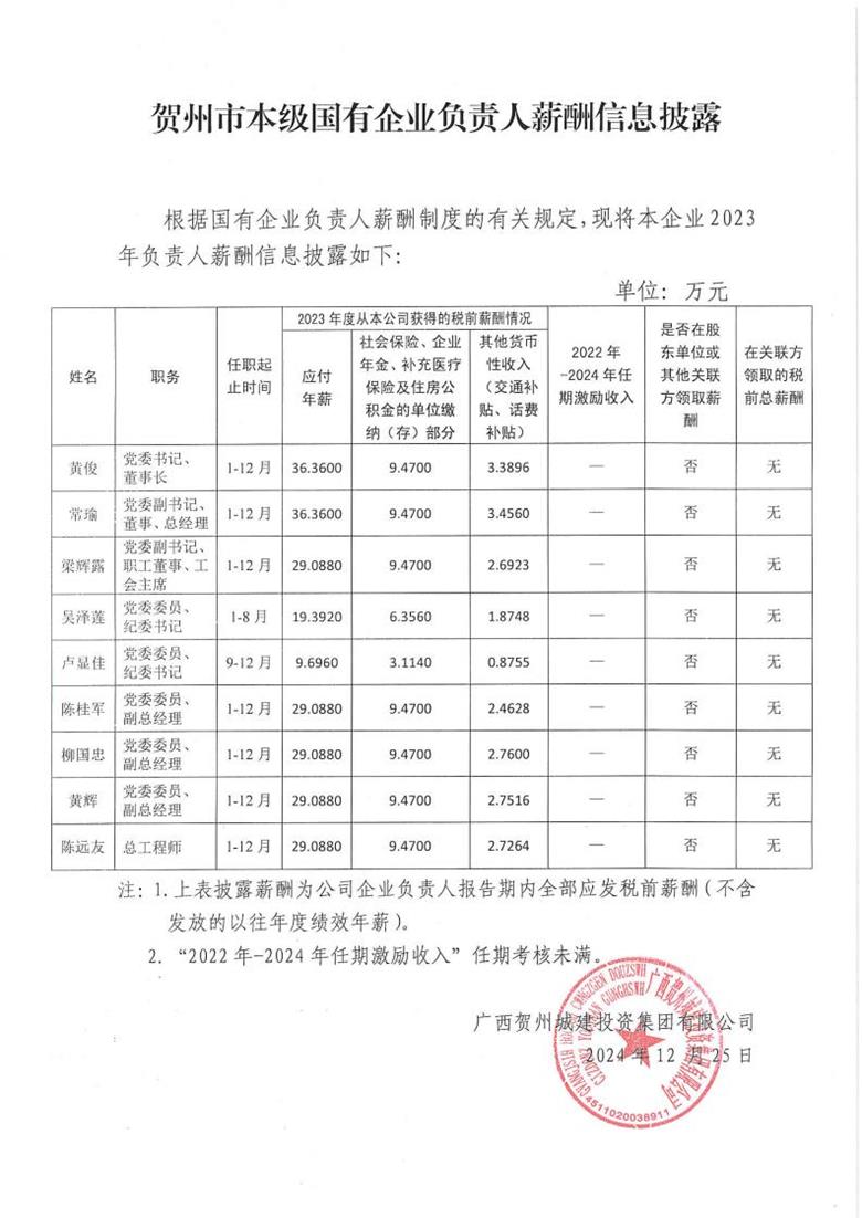 賀州市本級國有企業負責人薪酬信息披露