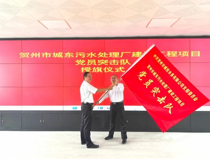 在活動現場,李羅清向黨員突擊隊隊員代表授旗,黨員突擊隊隊員代表作出承諾,表示將充分發揮先進性,確保出色完成賀州市城東污水處理廠建設工程項目各項收尾建設和調試運行工作。