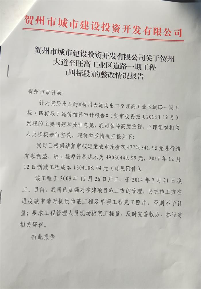 賀州市城市建設(shè)投資開發(fā)有限公司關(guān)于賀州市江南路網(wǎng)一期工程六、七標(biāo)段審計發(fā)現(xiàn)問題整改情況的報告 pdf